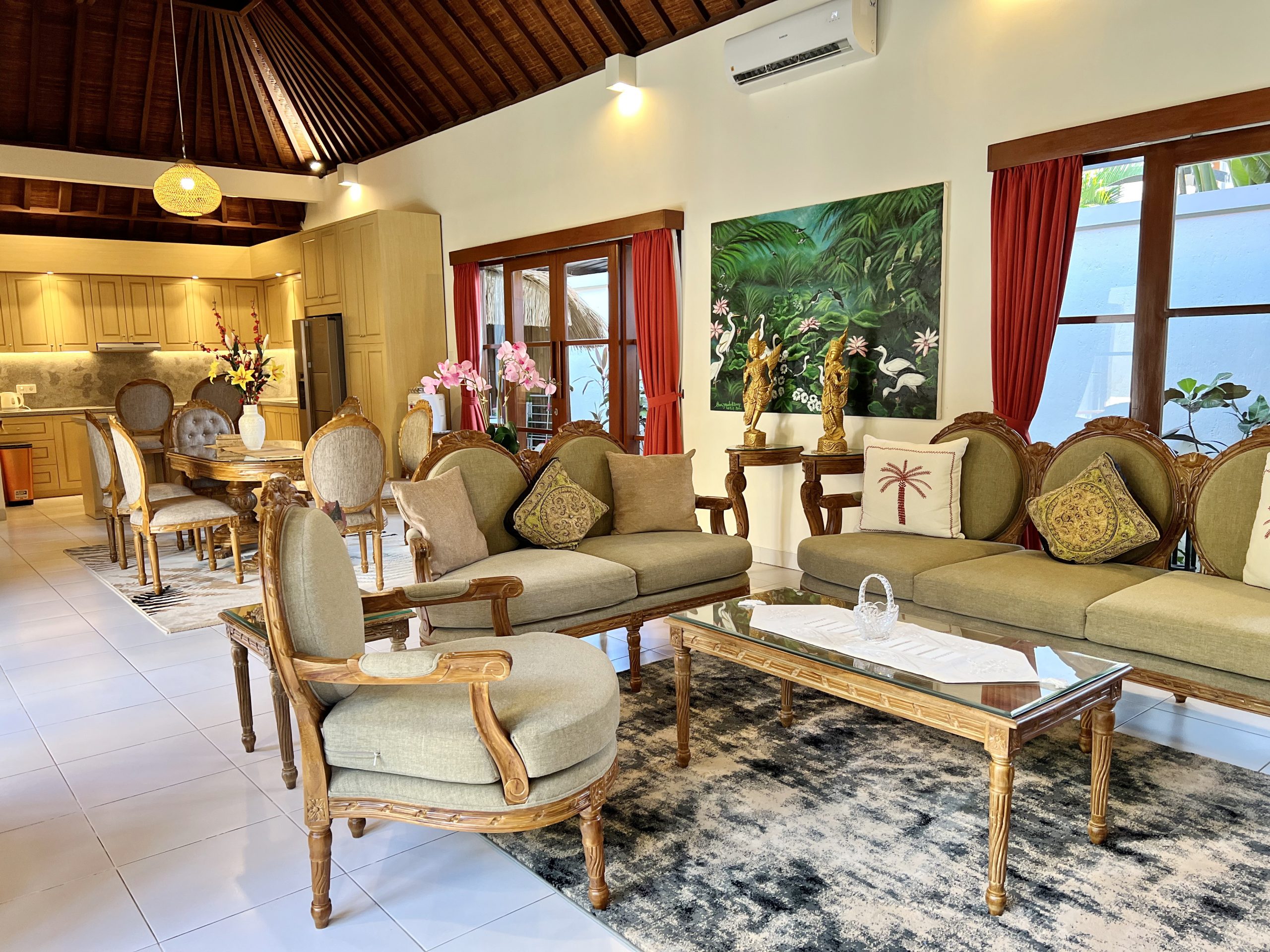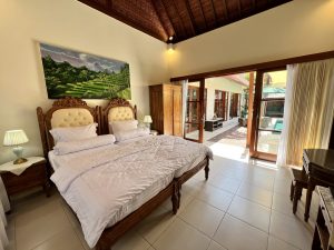 The living room is the central area of the Villa Baru. The room contains a sitting area with digital smart TV 65″, dining area and a modern fully equipped kitchen. Additional features are air-conditioning, ceiling fan, blind curtains, several sideboards with shelving space for clothing and guests’ personal belongings. The living room has a direct access to the master bed room, a Balinese laundry, a guest toilette and as well to the terrasse & swimming pool.